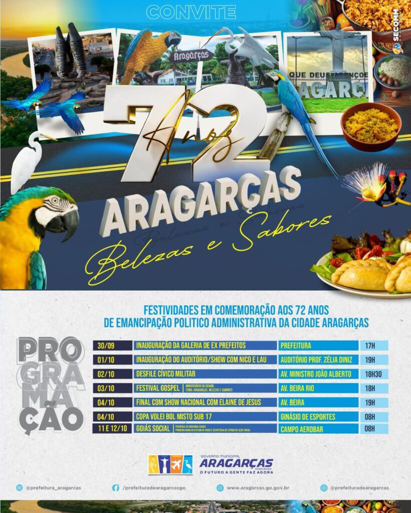 Aragarças chega aos 72 anos de emancipação político-administrativa e a Prefeitura organizou uma programação especial para celebrar a data. Com o tema “Belezas e Sabores”, a festa vai reunir momentos de cultura, esporte, fé e cidadania, valorizando a história e a identidade do município.